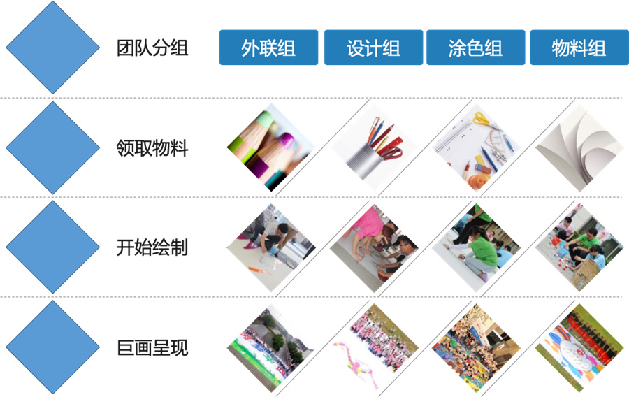 通过团队成员的共同努力,完成一幅具有企业文化代表意义的图画,用视觉的感观直接呈现在所有人的面前,提升企业员工的企业归宿感,同时,在前期制作过程中,团队成员需相互协作,增进团队成员间的凝聚力。《共绘蓝图》课程是一个侧重企业文化建设和团队协同作战的课程,在课程操作过程中,小组之间的分工是完成巨画项目的重要的基点,经过2-3个小时的工作,小组间充分的协作,完成一个完全属于自己公司创造的团队活动。