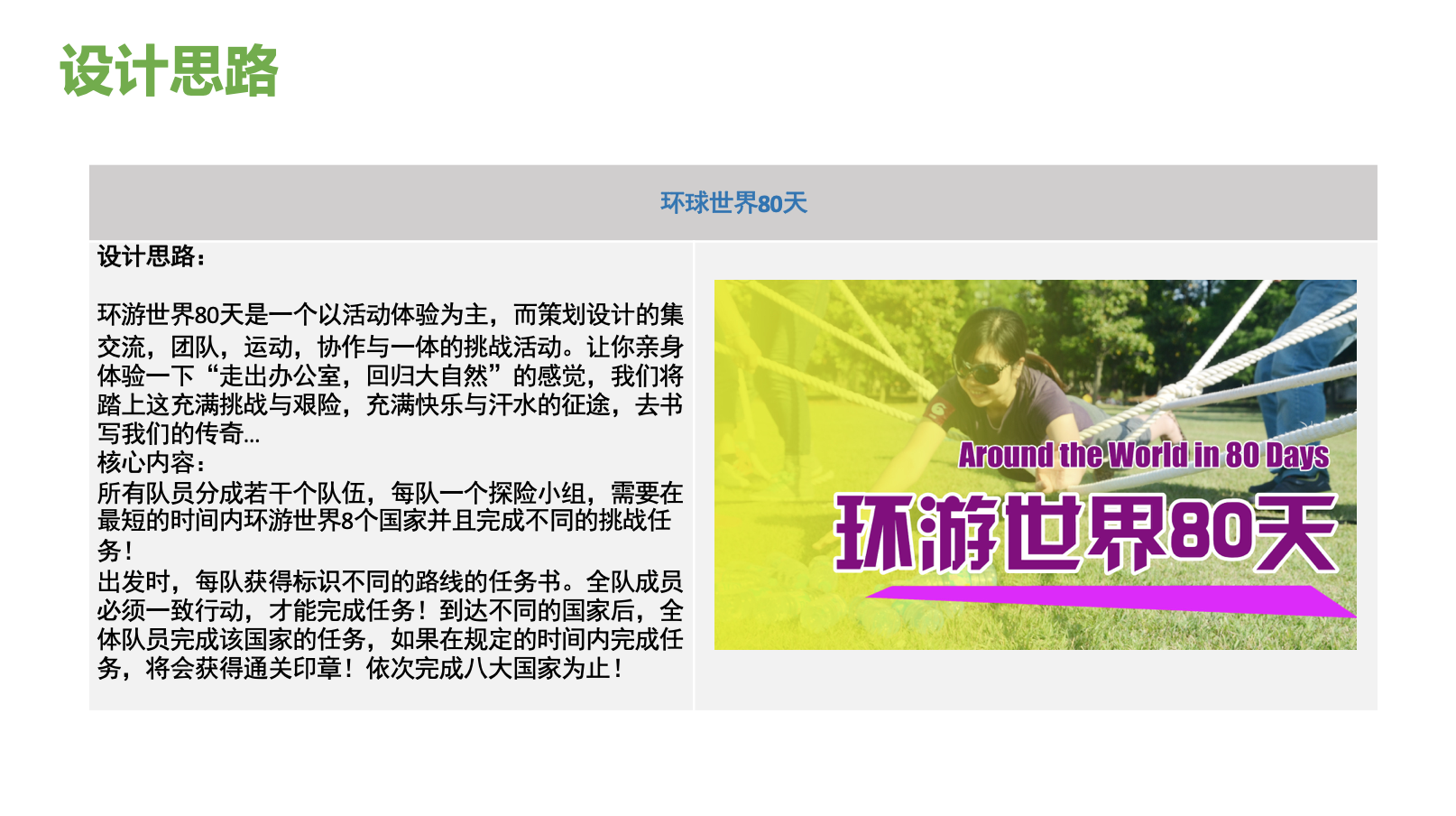 环游世界80天是拓展训练专门为充满青春活力的年轻人精心策划设计的集交流、团队、运动、协作于一体的挑战活动。让您亲身体验一下“走出办公室,回归大自然”的感觉,我们即将踏上这充满挑战与艰险,充满快乐与汗水的征途,去书写我们的传奇…