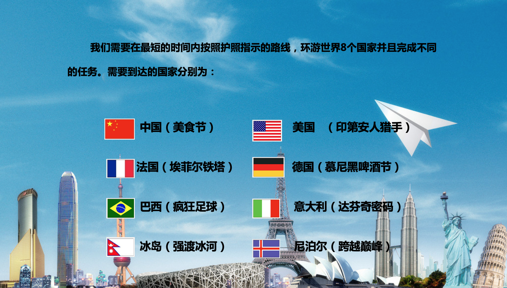 每个团队领取自己的护照与机票,开始接受挑战吧!