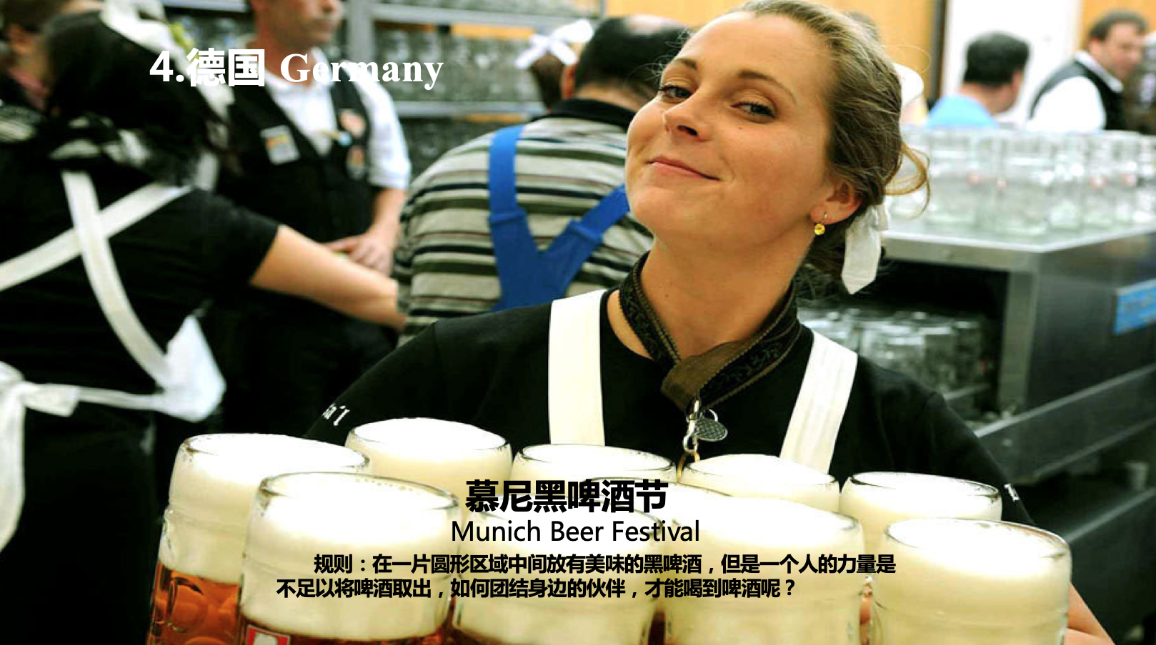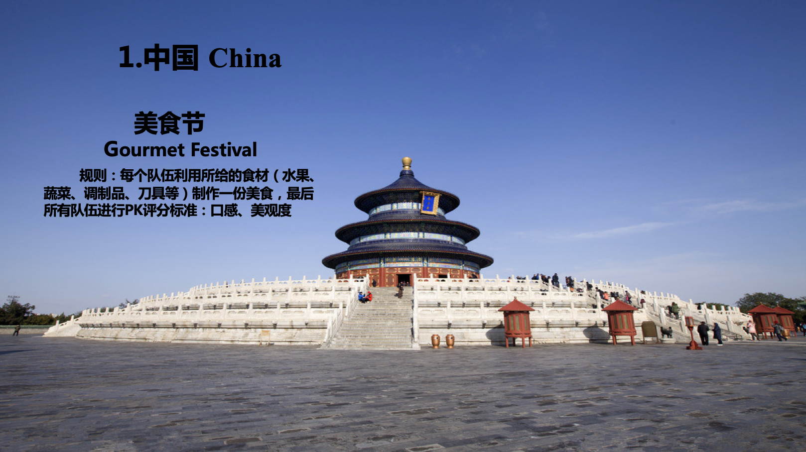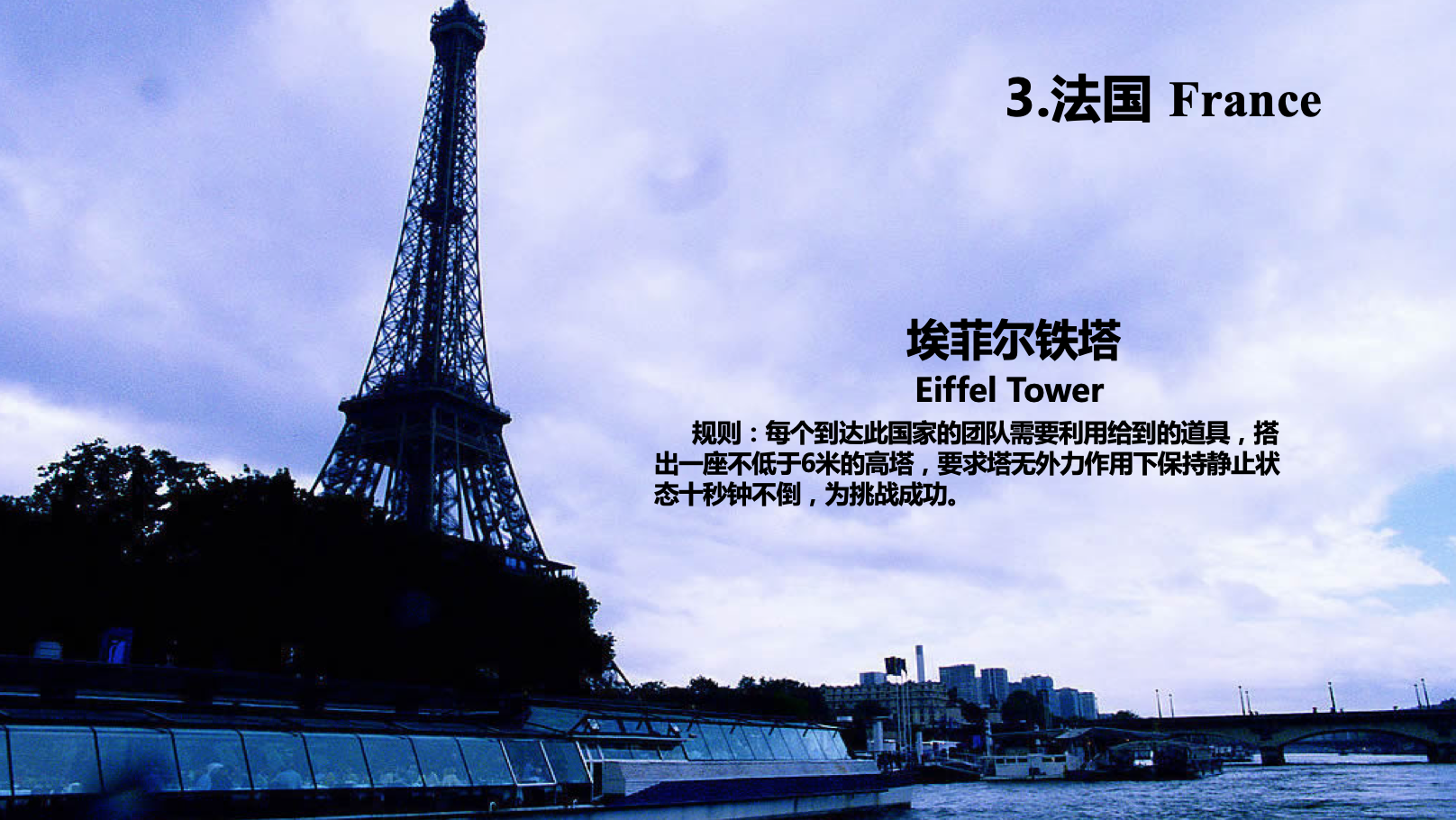 景区内会出现若干个国家(中国、法国、巴西、冰岛等),每个队伍利用骰子决定机票国家的顺序。每个国家会有土著或大使设卡(主线任务和随机任务),队伍采用徒步的形式,每完成一个任务会获得相应的分值与奖励,返回起点后稍作休息,准备用骰子决定下一个需要旅游的国家。(摇骰子时国家不能与本队已经去过的国家,否则队伍会在大本营接受教练“精神和身体的摧残”,骰子点数会越来越难仍)。